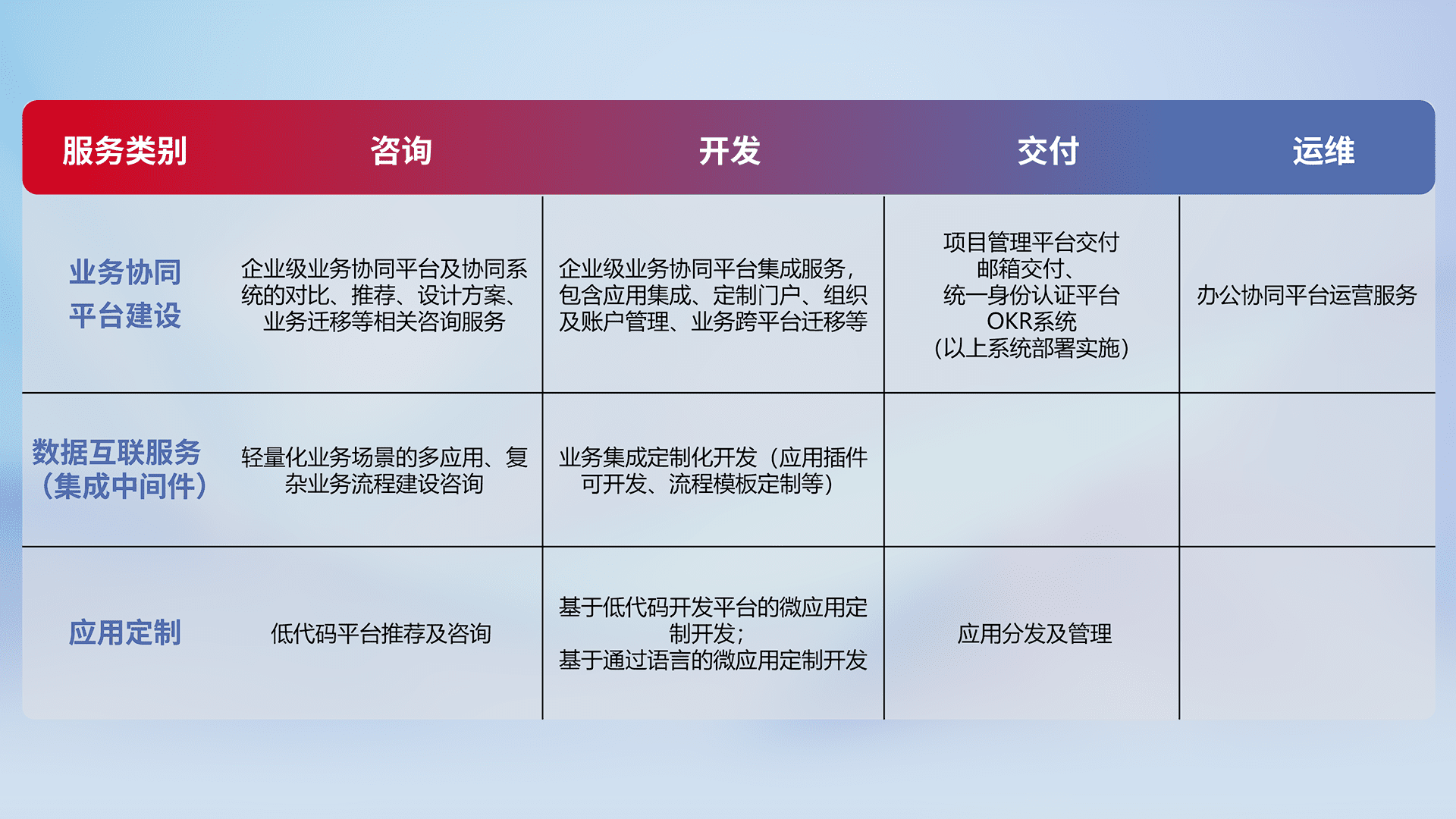 针对钉钉、、企微、、、、IDaas等平台级产品提供产品的规划、、、方案、、、交付、、、定制化开发等服务,,,,实现如统一协同办公、、、智能客户服务、、、混合会议管理、、智能数据查询、、、等业务场景,,,,实现数字化转型。。